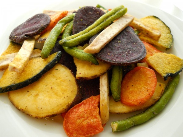 Did you know that many “veggie” chips are actually just made with potato flour and then treated with food coloring to look like veggies? Don’t be fooled! Read nutrition facts carefully to be sure that your chips list a vegetable as the first ingredient (Terra Chips pass the test). Also, be careful not to munch mindlessly, since even vegetable-based chips can be easy to overindulge in. You might also try baking your own kale chips!