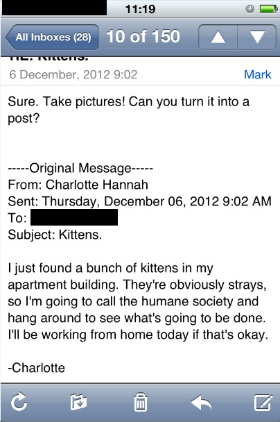 There were kittens in my apartment building. They were huddled in the corner of the enclosed entranceway to the building, between the outside door and the locked door that leads into the building itself. As there was no one around and it gets very cold out in the entranceway, I knew I couldn’t just leave them until I was done work. I emailed my boss, who understands as well as I do that cute kittens take priority over just about anything else in life: