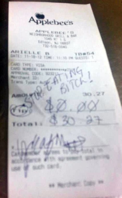 Not tipping is enough of an insult. Rubbing it in with a cruel statement about the appearance or worth of the server takes you from garden-variety douchebag to awful human being.